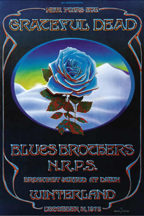 Many have referred to seeing a Grateful Dead concert as a religious experience. If so, Winterland was the Sistine Chapel of all the venues the Dead played. But whereas the latter was adorned with the High Renaissance art of Michelangelo, the halls of Winterland were bedecked with the psychedelic poster art of Stanley “Mouse” Miller, Rick Griffin, Wes Wilson, Alton Kelley, Victor Moscoso, and many others. Having seen both I have a strong preference for the latter, as both a gallery and house of worship. Commonly known as the “Blue Rose,” the poster for the 12/31/78 show was a collaboration by Alton Kelley and Stanley Mouse.
