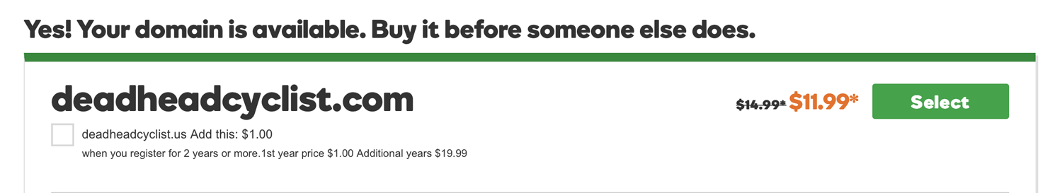 As is so often the case when I am out on two wheels in the wilderness, a moment of inspiration arrived, while I was listening to the March 13, 1985 concert from the Berkeley Community Theater – a show I happened to have attended 32 years earlier – when the words, “Deadhead Cyclist,” came to me, seemingly out of nowhere. I couldn’t wait to reach the lookout point on my ride to dial up GoDaddy on my iPhone and see if the URL, DeadheadCyclist.com, was available. To my amazement, this is what I discovered::